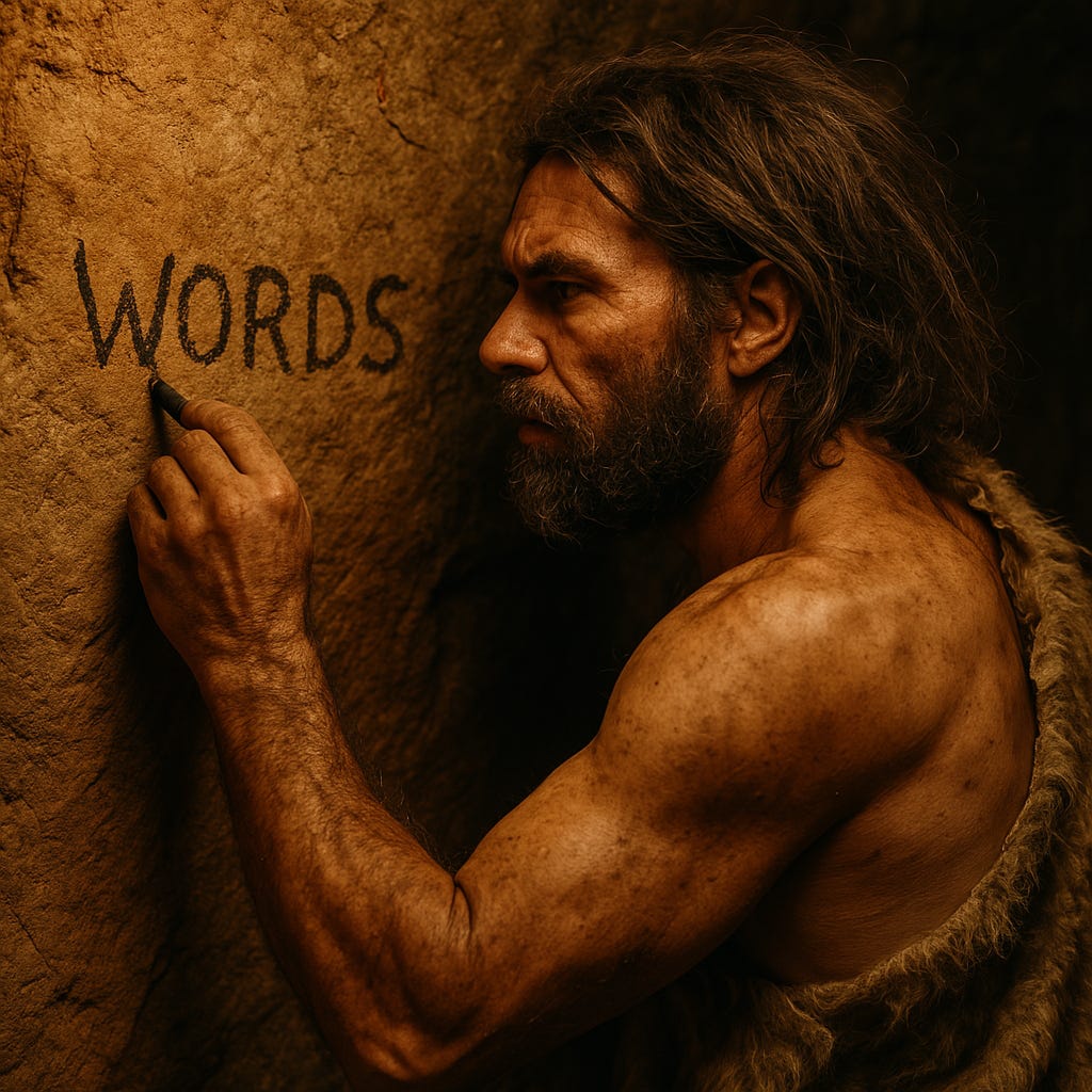A very funny literal prompt response where I asked ChatGPT to give me “a caveman writing words on a wall”